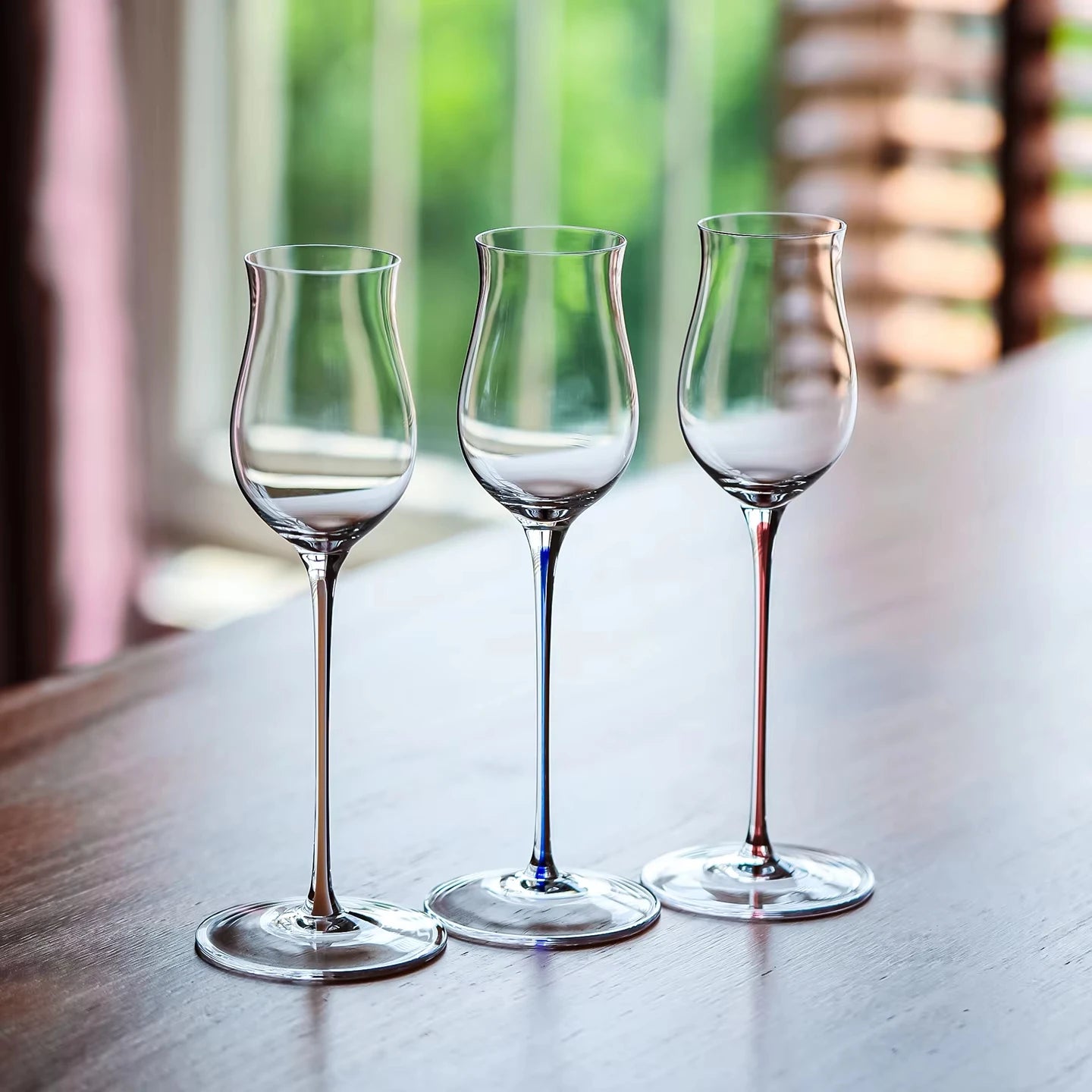 Copa acampanada de cristal artesanal con varilla roja, concebida para la degustación de whisky y vinos dulces.