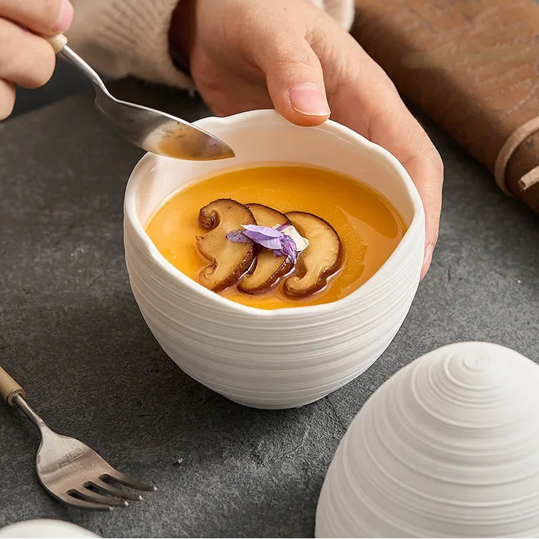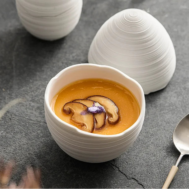 Descubre la versatilidad de nuestro cuenco de cerámica blanco en forma de huevo diseñado para transformar tu experiencia culinaria.