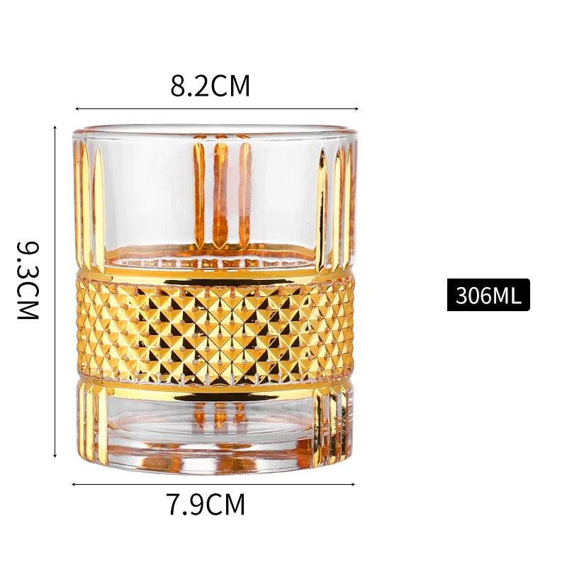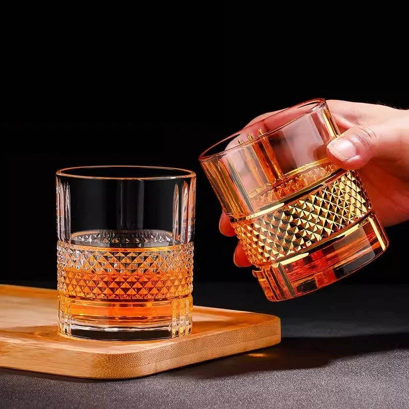 Vaso de cristal para whisky con una elegante línea dorada que combina un diseño contemporáneo con funcionalidad.